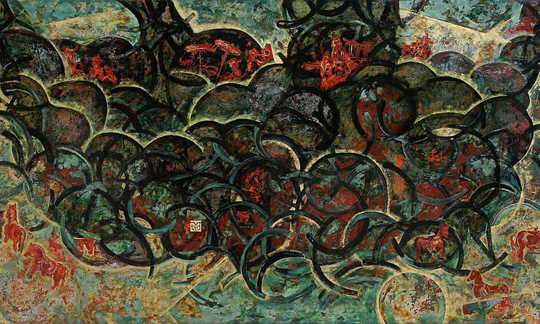 Trà Mi phác thảo bức vẽ từ đầu năm, bắt đầu thực hiện vào khoảng tháng 3-4. Trong tranh, cô sử dụng tượng ngựa đá, quan văn, quan võ ở các khu lăng tẩm tại Huế, biểu trưng cho quá khứ. Từ đây, một khối cây lớn được dựng lên với những cành đan cài, chồng chéo, tạo cảm giác những hình ảnh xưa đang dần tan ra, hòa vào không gian, để lại phía sau các pho tượng trơ trọi. Qua tác phẩm, Trà Mi gửi gắm suy nghĩ về sự tồn tại của những hiện vật cũ và giá trị của chúng ở hiện tại, thể hiện niềm trân trọng quá khứ.