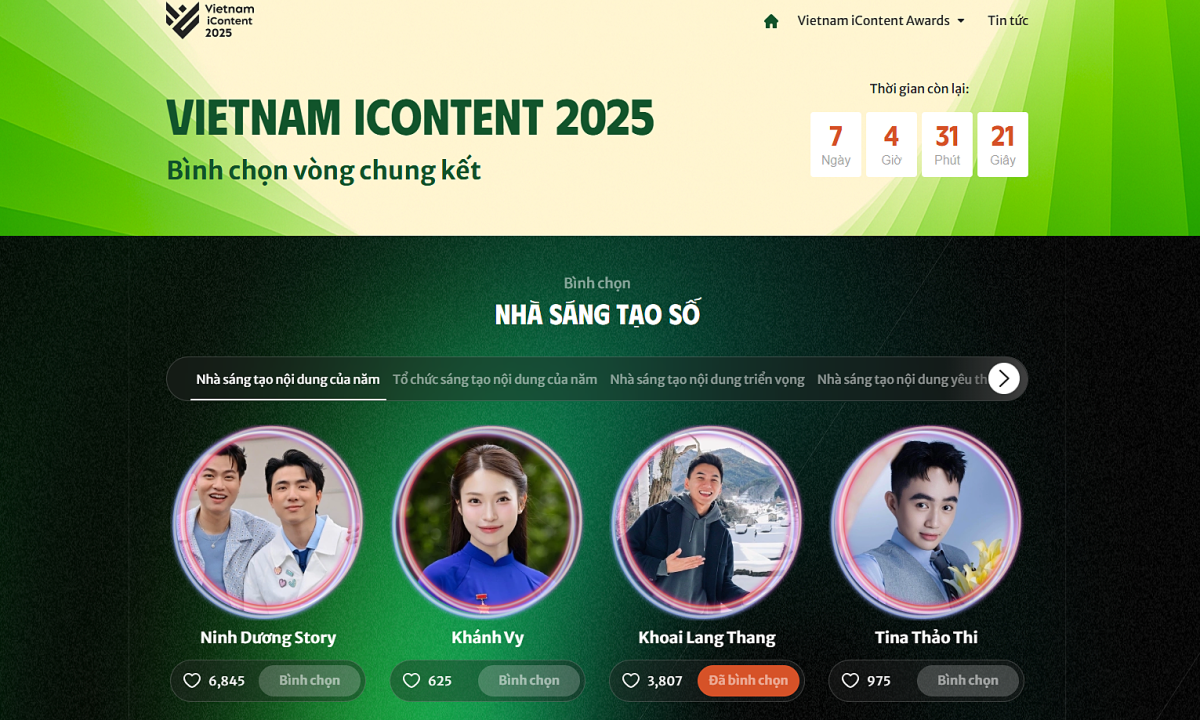 Trước thời điểm khép lại vòng bình chọn (18/11), người yêu nội dung số, cộng đồng sáng tạo và khán giả có thể tiếp tục tham gia bình chọn cho các ứng viên yêu thích tại trang website chính thức của chương trình. Mỗi lượt bình chọn là một sự ghi nhận, không chỉ dành cho người sáng tạo mà còn góp phần khẳng định giá trị của nội dung Việt trong bối cảnh kinh tế sáng tạo toàn cầu đang phát triển mạnh mẽ.