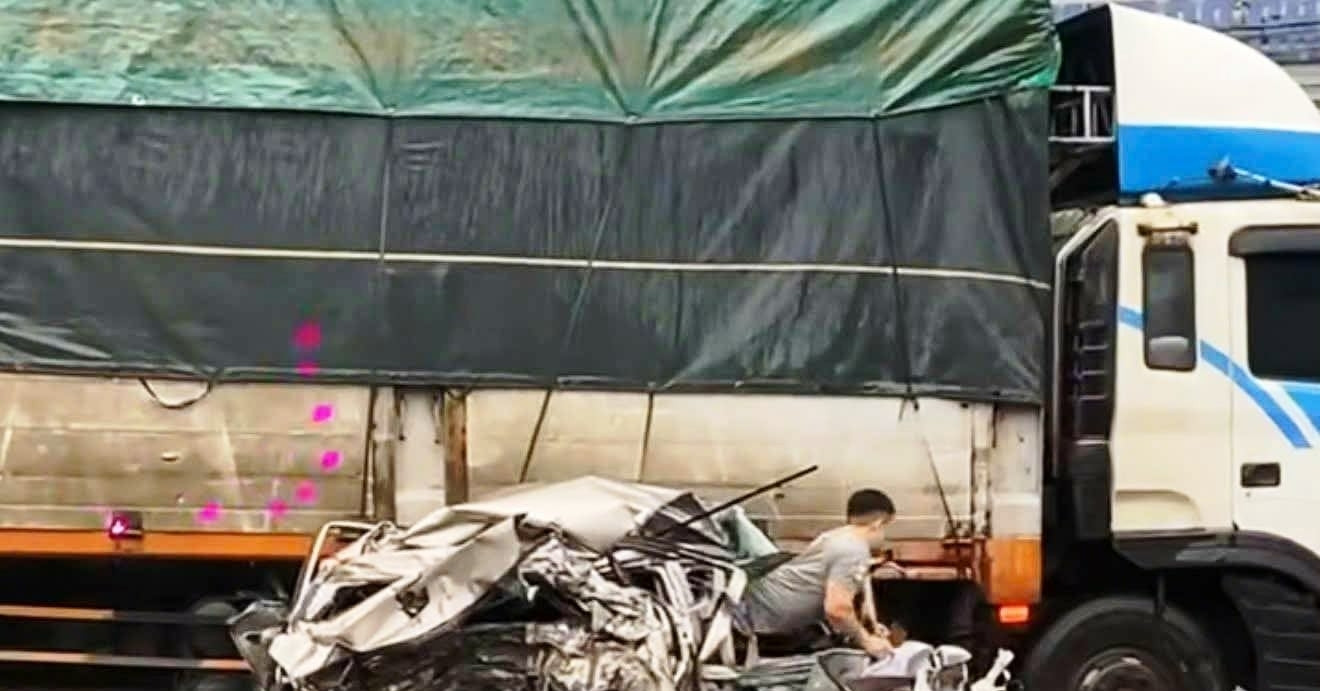 Xe ô tô con va chạm với xe tải và xe đầu kéo trên QL 1A, bị vò nát hoàn toàn, nhưng tài xế may mắn thoát chết và bò ra ngoài qua cửa kính trước.