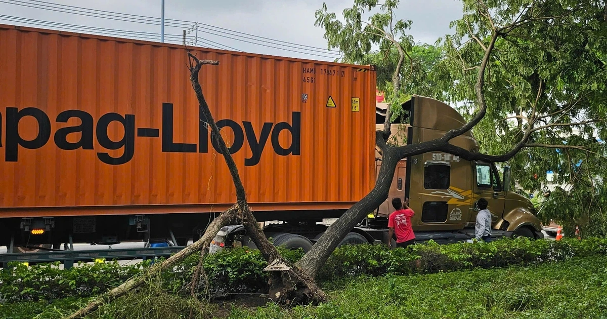 Hơn 18 giờ ngày 3.7, Công an xã Bình Lợi (TP.HCM) phối hợp Đội CSGT An Lạc (Phòng CSGT Công an TP.HCM) giải quyết hiện trường xe container va trúng cây xanh, khiến cây ngã đè phương tiện này trên đường Trần Văn Giàu.