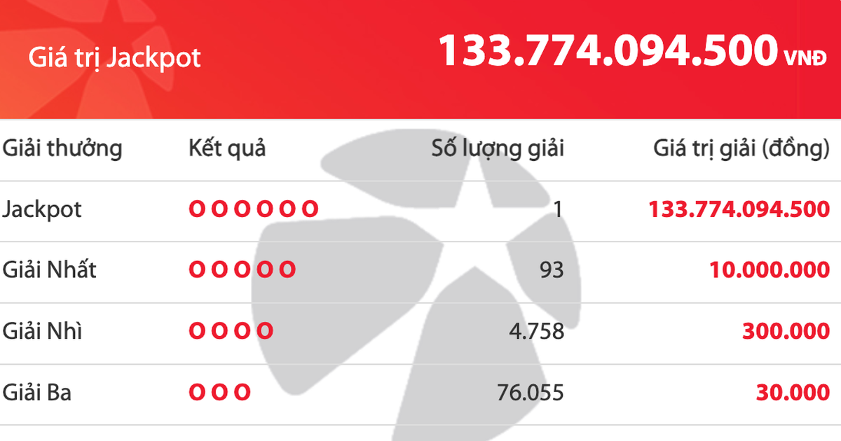 Sáng 23.10, Vietlott thông báo kỳ quay số mở thưởng 1422, diễn ra vào tối ngày 22.10 có 1 khách hàng trúng thưởng Jackpot trị giá 133.774.094.500 đồng tại tỉnh Khánh Hòa.