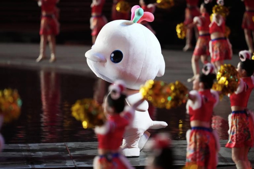 Linh vật cá heo trắng trong lễ khai mạc Đại hội thể thao toàn quốc lần thứ 15 của Trung Quốc tại Quảng Châu, tỉnh Quảng Đông, miền nam Trung Quốc, ngày 9/11. Ảnh: Tân Hoa Xã. |