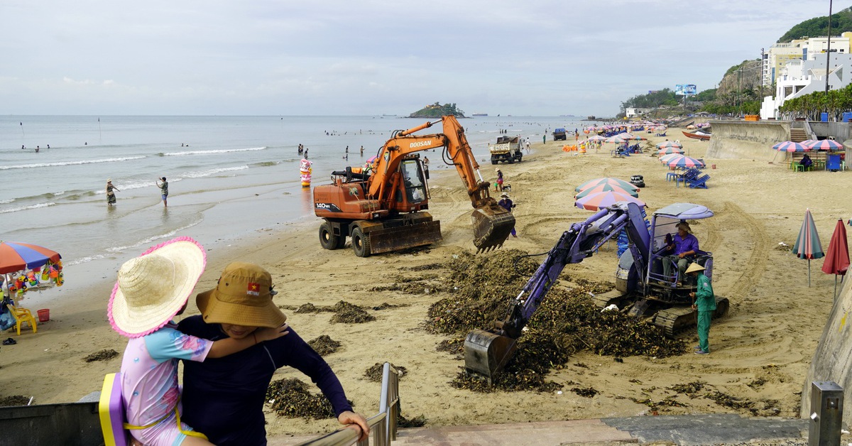 Nhiều ngày qua, mỗi ngày có hàng chục tấn lục bình, rác thải tấp vào biển Vũng Tàu. Việc thu gom diễn ra nhanh chóng để bãi tắm đón du khách những ngày đầu mùa hè.