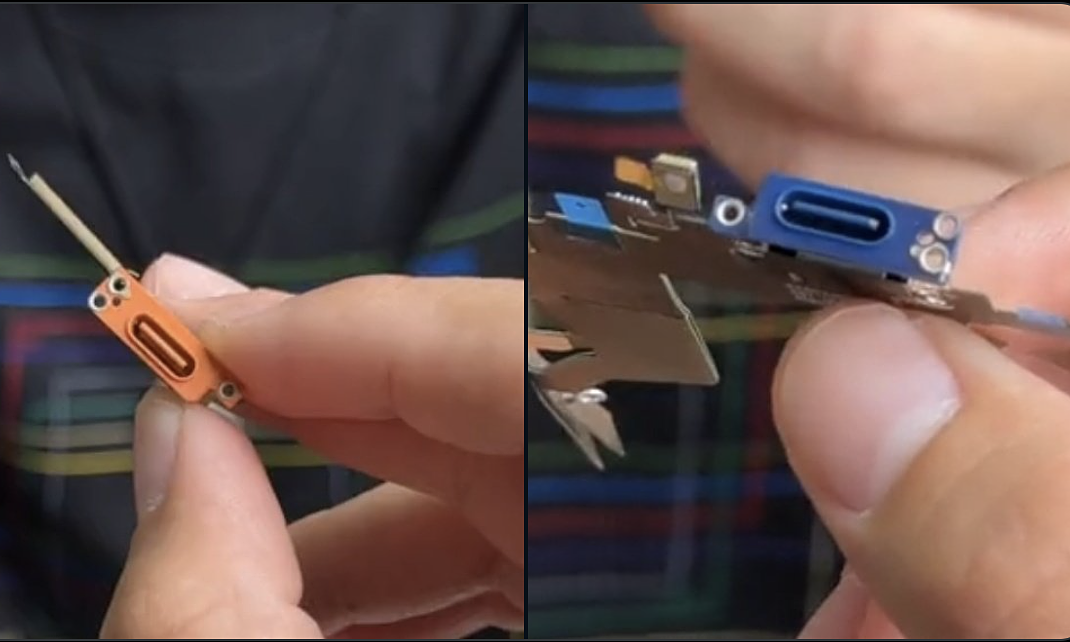 Bên cạnh đó, hình ảnh linh kiện cổng USB-C với màu cam và xanh dương, được cho là của iPhone 17 Pro, cũng bị rò rỉ. Điều này khớp với tin đồn trước đó rằng iPhone 17 Pro dự kiến có 4 màu: cam, xanh dương, trắng và đen. Màu xanh dương có vẻ sáng hơn so với dự đoán ban đầu, có thể do chất lượng chụp ảnh kém hoặc Apple đã quyết định sử dụng một sắc độ xanh mới.