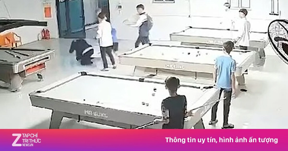 Hình ảnh cho thấy, thời điểm xảy ra vụ việc có khoảng 8-9 học sinh đứng quanh bàn bida. Sau đó, một nam sinh bất ngờ lao tới tấn công người mặc áo đen khiến nạn nhân ngã xuống sàn, nhóm còn lại liên tiếp dùng gậy nghi là cơ bida đánh tới tấp.