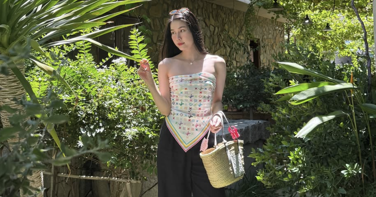Nàng cũng có thể sáng tạo hơn với bản phối túi cói cùng chiếc khăn lụa, biến tấu thành áo bằng cách quấn khéo léo và kết hợp cùng quần ống suông rộng rãi. Cách phối này không chỉ thể hiện sự tinh tế mà còn mang lại vẻ phóng khoáng, thoải mái. Chiếc khăn lụa thêm phần thanh lịch, tạo điểm nhấn độc đáo, khiến tổng thể trang phục nổi bật và cuốn hút.