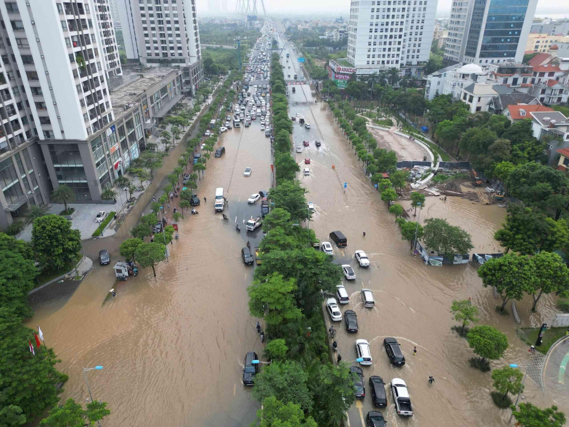 Ghi nhận trong sáng 28/8, nhiều đoạn trên đường Võ Chí Công vẫn chìm trong nước, đặc biệt tại khu vực tòa nhà UDIC hướng vào trung tâm và trước Lotte Mall Tây Hồ hướng ra ngoại thành.