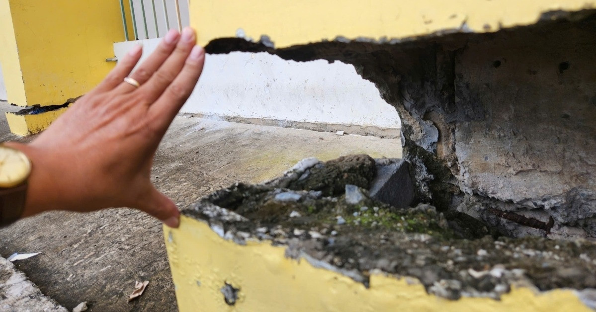 Không chỉ nhà dân, các công trình kiên cố cũng chịu ảnh hưởng nghiêm trọng. Trung tâm Văn hóa – Thể thao phường An Lạc hiện đã xuống cấp nặng nề, với các cột bê tông chịu lực bị đứt gãy ngang thân, khe hở rộng đến 20cm.
