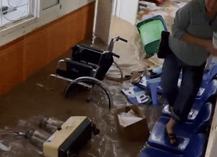Nước nhanh chóng dâng cao ngập nhiều phòng ban trong bệnh viện, cuốn trôi nhiều vật dụng và làm hư hại trang thiết bị.