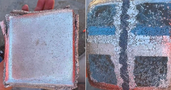 Lực va chạm mạnh đến mức khiến toa ram bật ngược lại, trong khi tấm thép chỉ bị biến dạng nhẹ. Lớp kim loại xốp đã hấp thụ gần như toàn bộ năng lượng va chạm, chứng minh khả năng phân tán lực và tự “hi sinh” để bảo vệ kết cấu thép bên dưới.