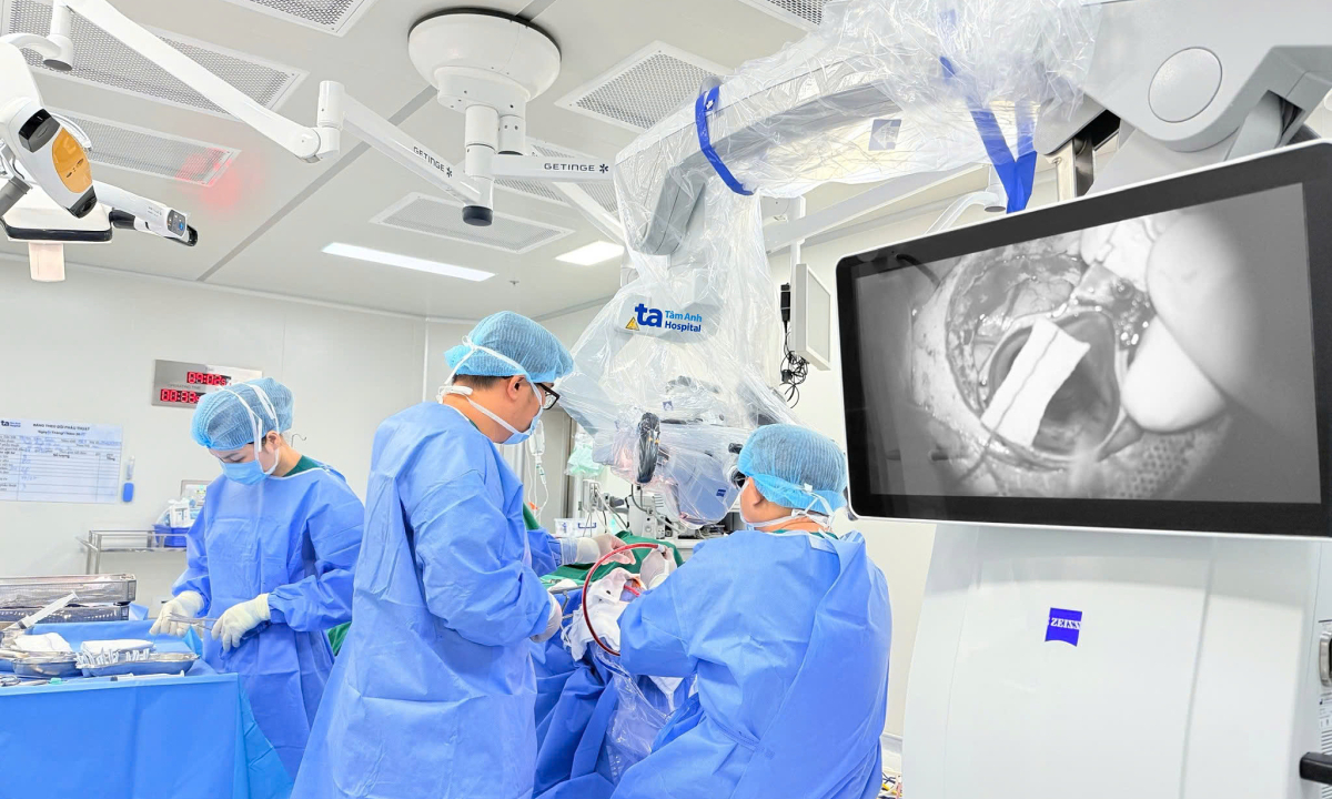 Dưới kính vi phẫu AI Zeiss Kinevo 900 với hình ảnh 3D, êkíp xác định chính xác vị trí khối máu tụ, quan sát rõ từng chi tiết mạch máu nhỏ, bóc tách lấy sạch máu tụ mà không gây thêm sang chấn. Vật liệu cầm máu FloSeal được sử dụng để giảm nguy cơ tái xuất huyết.