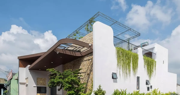 Thay đổi ấn tượng đầu tiên có thể thấy ở ngay mặt đứng của công trình. Từ nhà kho xập xệ trở thành ngôi nhà kiên cố kiến trúc hiện đại với vật liệu tự nhiên và yếu tố cây xanh. Điểm nhấn là mái hiên cong ấn tượng và các mảng xanh rủ xuống, mang lại vẻ đẹp hài hòa.