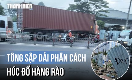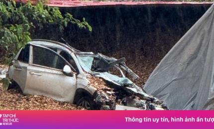 Sau va chạm trên Quốc lộ 28 (Lâm Đồng), xe container lật nghiêng đè bẹp dúm ôtô con, khiến 5 người trên hai xe bị thư