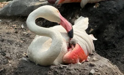 Giữa bầy chim hồng hạc đẹp rực rỡ, có một thành viên 'nhí' duy nhất tung tăng đùa nghịch, mang lại niềm vui cho người