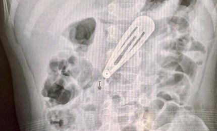 Tại Bệnh viện Nhi Trung ương, kết quả chụp X-quang và siêu âm cho thấy bé bị tắc ruột, được mổ cấp cứu.