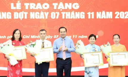 TPO - Sáng 7/11, tại Bảo tàng Tôn Đức Thắng, Đảng ủy UBND TPHCM tổ chức lễ trao tặng Huy hiệu Đảng đợt ngày 7/11 nhân
