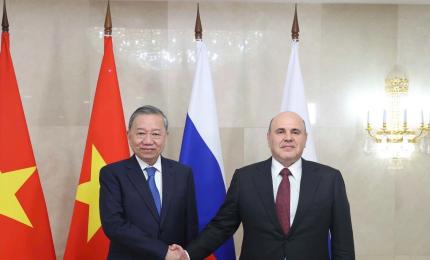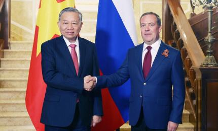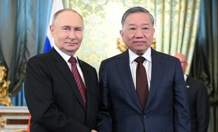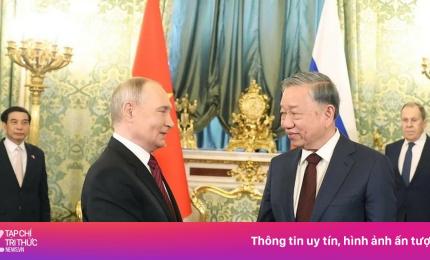 Trưa 10/5/2025, giờ địa phương (chiều cùng ngày, giờ Hà Nội), tại Điện Kremlin ở thủ đô Moskva, Tổng Bí thư Tô Lâm hộ