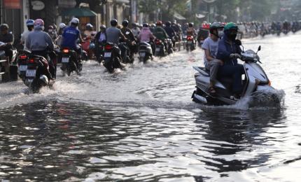 Người dân TPHCM xắn quần, co chân vượt đường ngập lênh láng vào giờ cao điểm