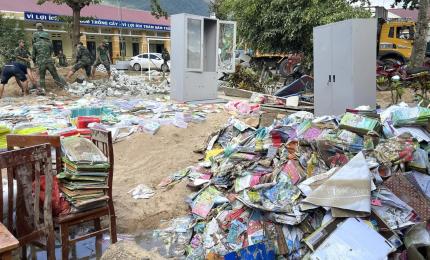 Sau bão Kalmaegi (bão số 13), mưa lớn kéo dài khiến nước sông Kỳ Lộ dâng cao, nhấn chìm Trường tiểu học Phú Mỡ ở xã P
