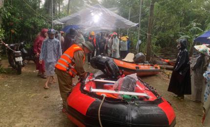 Phó thủ tướng ngồi thuyền vượt lũ vào thăm bà con tại thôn Hữu Tân (xã Ninh Châu) và thôn Cây Đa (xã Diên Sanh).