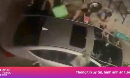 Đoạn clip ghi lại cảnh nhóm người bao vây và liên tục dùng các dụng cụ bàn ghế, gậy gộc đập vào xe ôtô.
