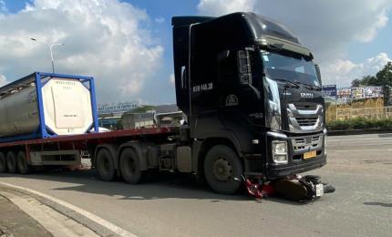 Trong lúc ôm cua rẽ phải vào quốc lộ 1K, xe đầu kéo đã cuốn xe máy vào gầm.