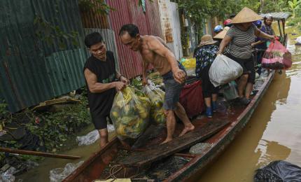 Mưa lớn kéo dài do hoàn lưu bão số 10 khiến nước sông Hồng dâng cao, nhấn chìm hoa màu, cô lập bãi giữa và gây ngập ú