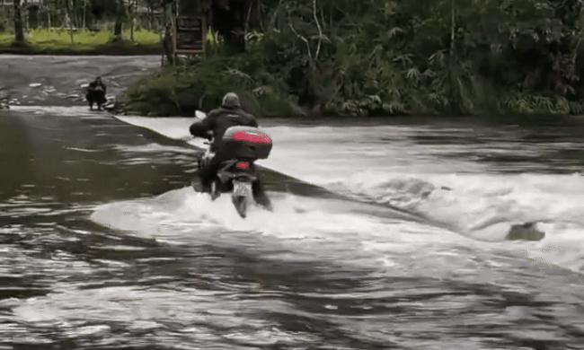 Tuy nhiên, vào mùa mưa, dòng nước có thể mạnh như nước lũ và che phủ hoàn toàn lối đi - như đã xảy ra dịp cuối tuần qua. Ngày 27/9, một nhóm người đi xe phân khối lớn đến cầu, và một người chạy qua trước, trong khi những người khác đứng cổ vũ và ghi hình.