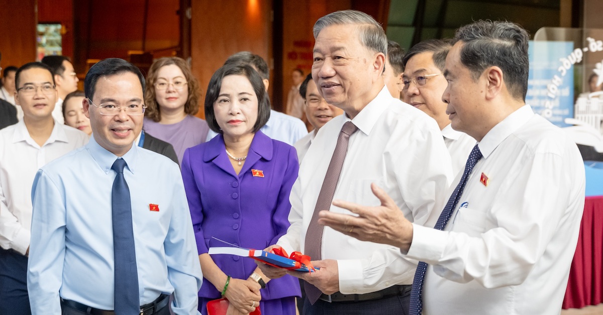 Tổng Bí thư Tô Lâm, Thủ tướng Phạm Minh Chính, Chủ tịch Quốc hội Trần Thanh Mẫn và nhiều lãnh đạo dự hội nghị chuyên đề 'Bình dân học vụ số - Quốc hội số: Khung kiến thức, kỹ năng số cho Quốc hội hiện đại'.