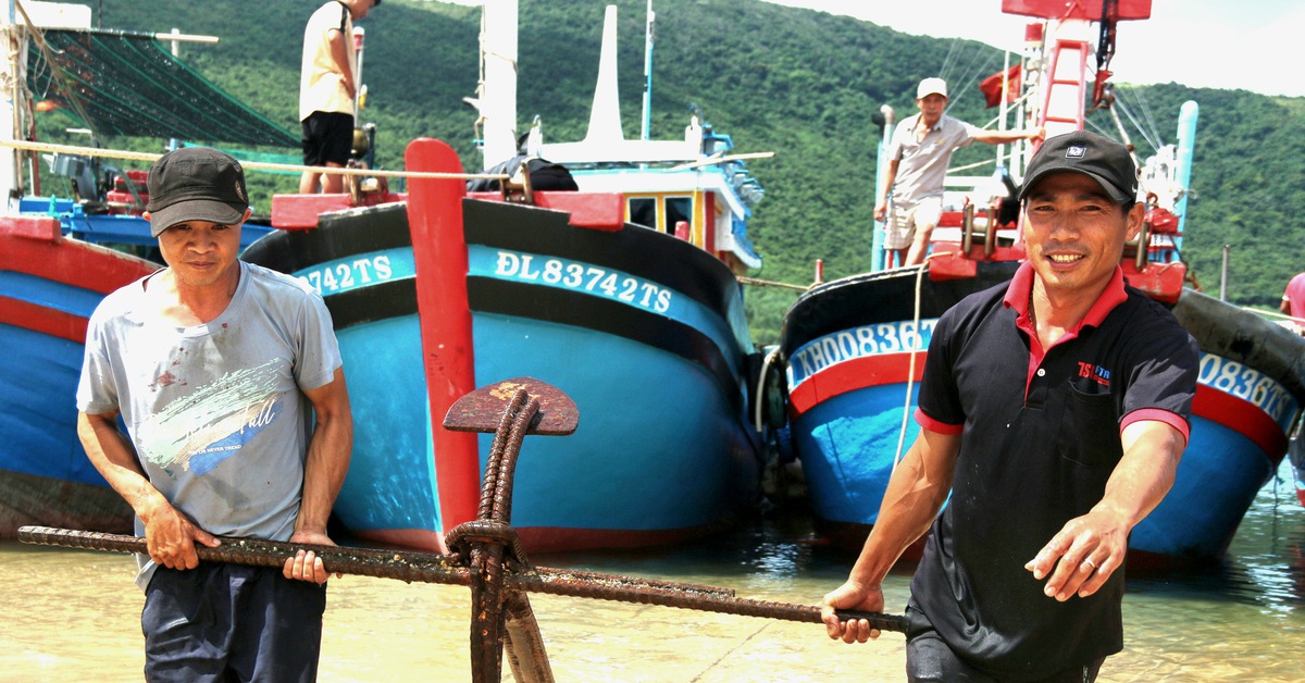 Cách đó khoảng 2km, anh Nguyễn Minh Quý (38 tuổi, chủ tàu KH 00836 TS) cùng các thuyền viên đang khẩn trương thả neo tàu tại vùng biển kín gió thuộc thôn Đầm Môn (xã Đại Lãnh) nhằm giảm thiểu thiệt hại khi bão đổ bộ.