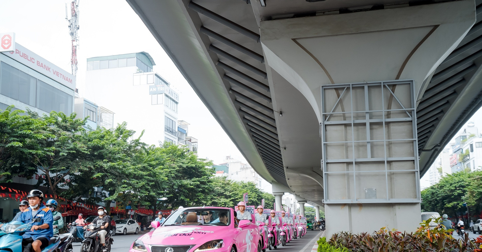 Sáng 14/10, người dân Thủ đô bắt gặp một “đoàn diễu hành pijama” đi qua nhiều tuyến đường trung tâm. Dàn mẫu nam trong trang phục ngủ, di chuyển bằng xe mui trần và SH hồng nổi bật nhanh chóng thu hút sự chú ý của đông đảo người dân trên phố.