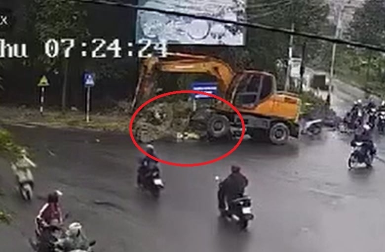 Tình huống giao thông: Chiếc xe máy xúc vào cua sát lề đường ngay khi hai người đi xe máy ngược chiều lao tới. Cán qua xe máy, chiếc xe này phải kênh một bên bánh lên để kéo người và xe máy ra ngoài. Chưa rõ thương vong.