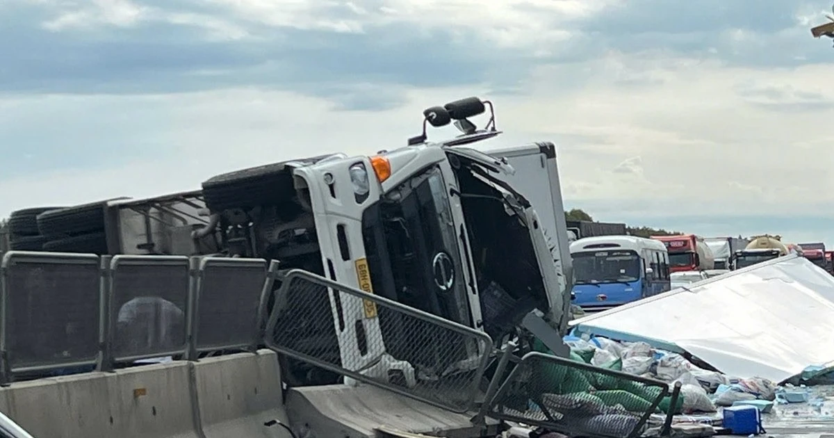 TPO - Xe tải thùng đông lạnh mang biển số tỉnh An Giang lưu thông trên cao tốc Vĩnh Hảo - Phan Thiết bất ngờ tông dải phân cách cứng rồi lật nghiêng giữa đường, khiến hàng hóa văng khắp mặt đường.