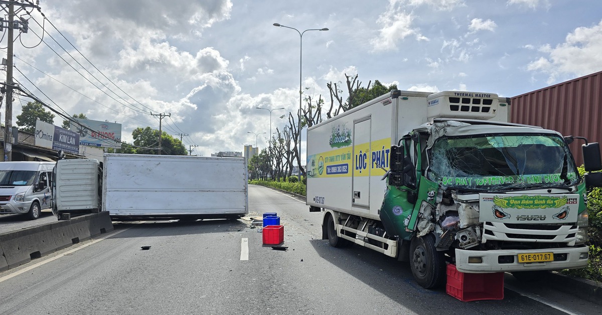 Sáng 24-8, xe tải thủng bánh đang đậu trên đường Đỗ Mười (phường Tam Bình, TP.HCM) bất ngờ bị xe tải khác tông từ phía sau, lật ngang.